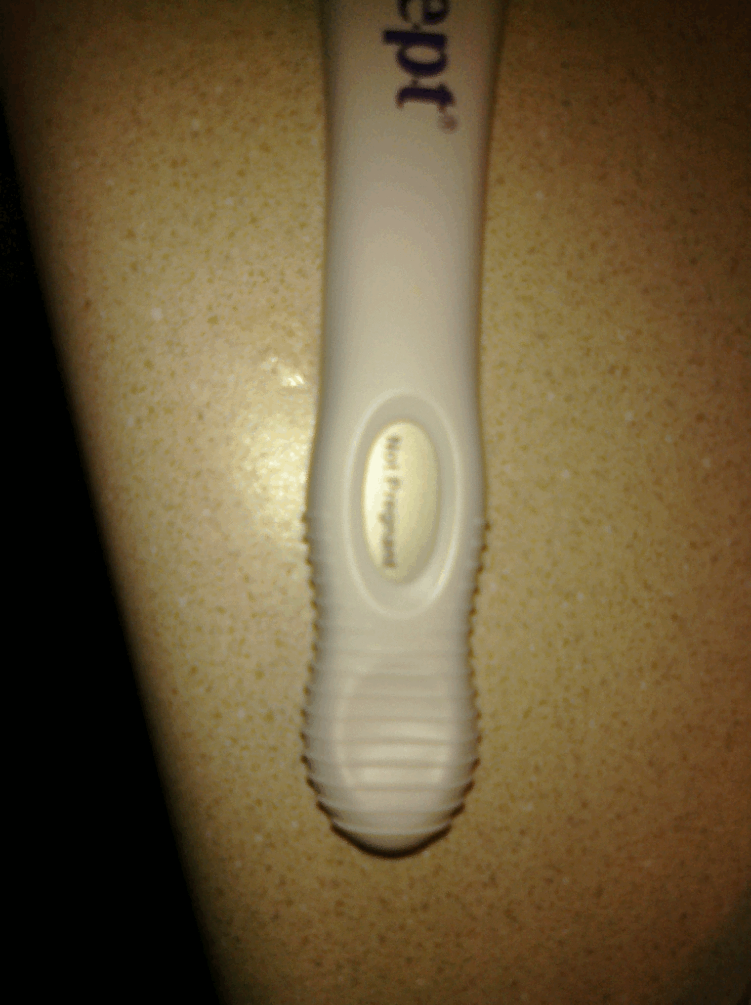 After waiting a week for my cycle to start with no avail, we began to get pretty nervous. We finally bit the bullet and went to buy a pregnancy test. I was relieved that we didn’t run into 800 people we knew while standing in the “family planning” aisle, puzzling over boxes of digital sticks. (By the way, I LOVE how the tests are located directly under the condoms and lube. Brilliant.) We ended up buying the one on the discount rack. (It wasn’t expired and it was CHEAP!)