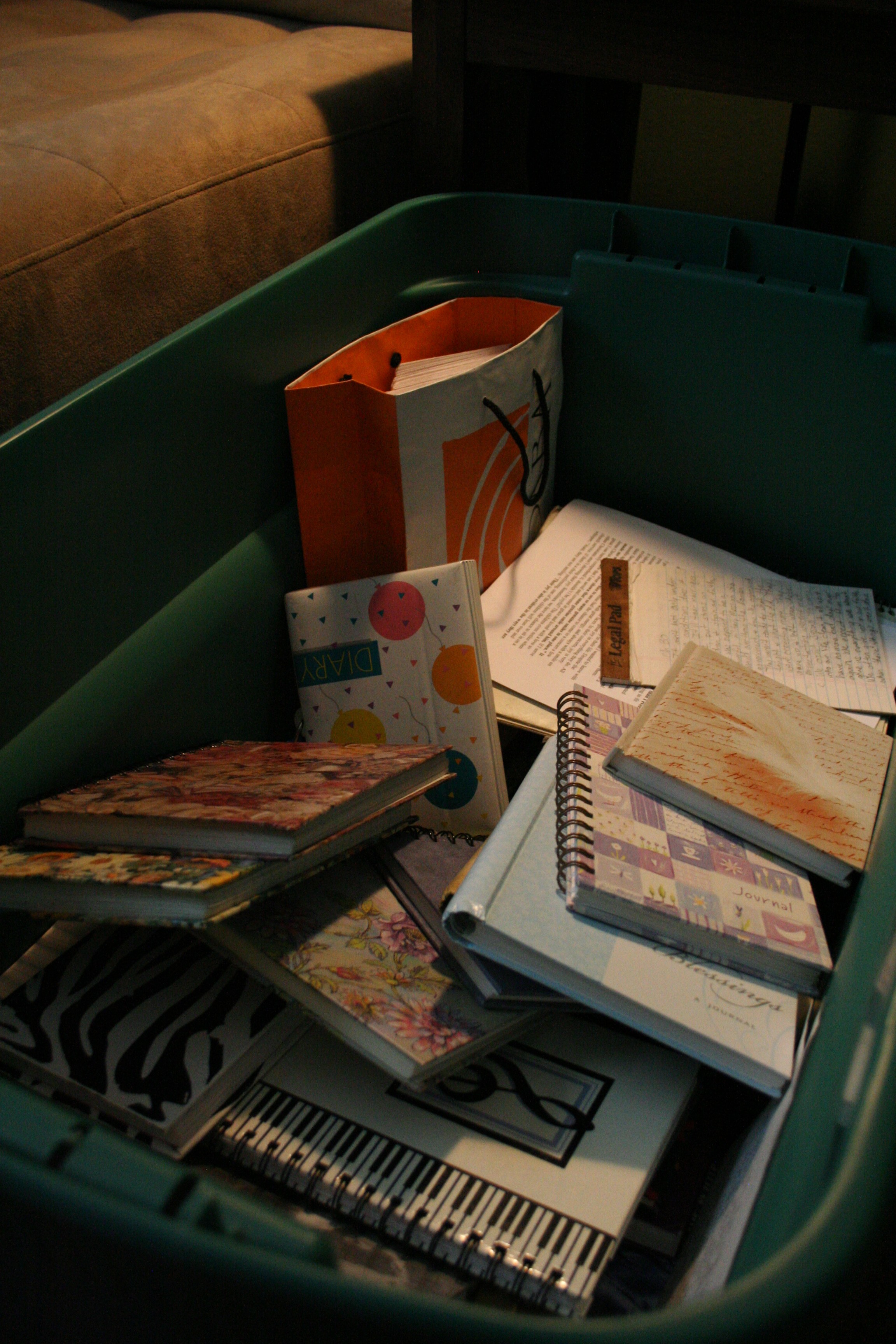 Every time I open this tote, I am usually surprised at how much is in there. I have pretty journals with flowery print, boring spiral notebooks, and Bible studies from years ago. There are my everyday here is what happened in my life journals, prayer journals, notebooks with song ideas sprawled in them, and even little scraps of paper that have snippets of something I deemed worthy of preserving. Sometimes I wonder if holding onto these is practical. It does take up lots of space, and when I’m gone, will anyone really want to read them? But then my journals make the list of the three things I would grab if my house were on fire. These are special to me. They’re filled with memories that have slipped from my subconscious. They show how I’ve changed and matured through the years. Above all, the physical act of putting pen to paper is so therapeutic to me that I can’t see giving up on journaling. So I will continue to write, and continue to fill totes.