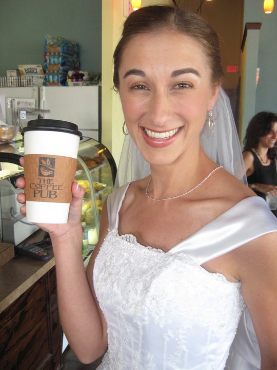 I allowed myself to be pampered as my hair and makeup were done. Then we marched next door to The Coffee Pub, my place of employment at the time. I had asked for permission to change in the office upstairs, to save time, and so we could go straight to pictures. I think I remember Drew calling me while I was being slipped into and tied up in my dress. A coworker stood downstairs, singing, “Going to the Chapel” while washing dishes. We finished and walked downstairs, my sister being oh so careful to keep my train lifted and out of any stray coffee grinds.