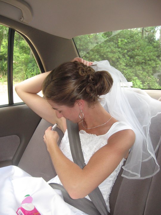 For some odd reason, my scatterbrained bridal brain had only shaved one armpit that morning. Not a huge deal, and it wasn’t too much hair, but it was still noticeable. I wanted to say, “Don’t worry about it, I’ll be fine,” but all of a sudden it was a HUGE problem. I would have spent the entire day like I was in one of those Sure/unsure deodorant commercials. Jess and Em realized that, and with no eye rolling or sighs of frustration, they offered a solution. Jess pulled off into a parking lot and Em bolted from the passenger side and to the trunk, rummaging through my luggage and emerging with my toiletry bag. She brought it to me, I found my razor, and did a quick dry shave.