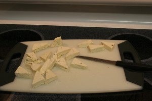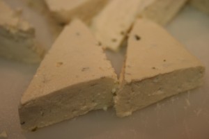 I opened the package and drained it, gently squeezing it to remove all excess water. Apparently you’re supposed to put something heavy on it and let it sit for an hour so the water can slowly ooze out, but yet again, I didn’t have that kind of time.