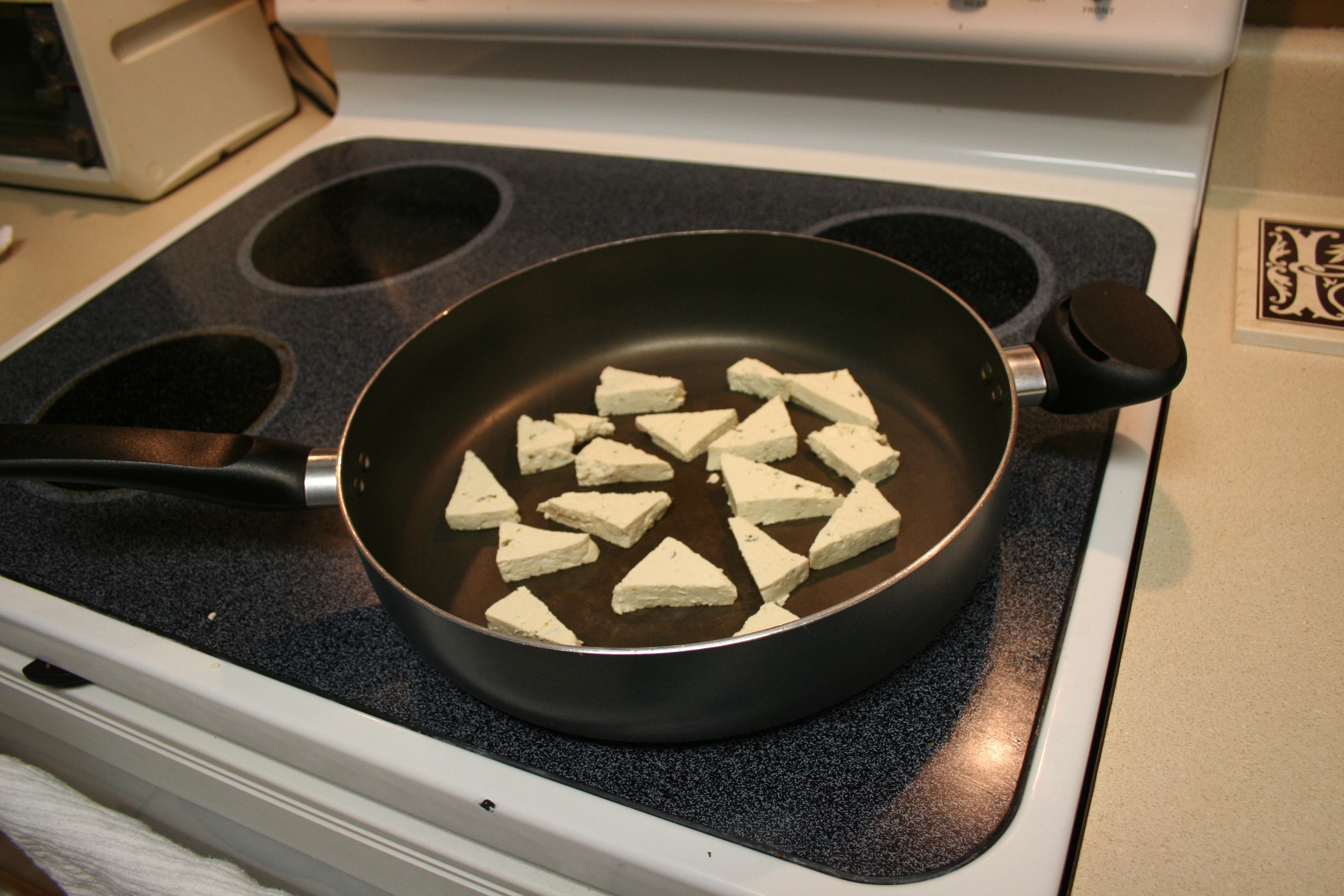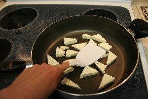 I put the pieces in between a kitchen towel and squeezed gently yet again to get more water out. Then I placed them in the pan.