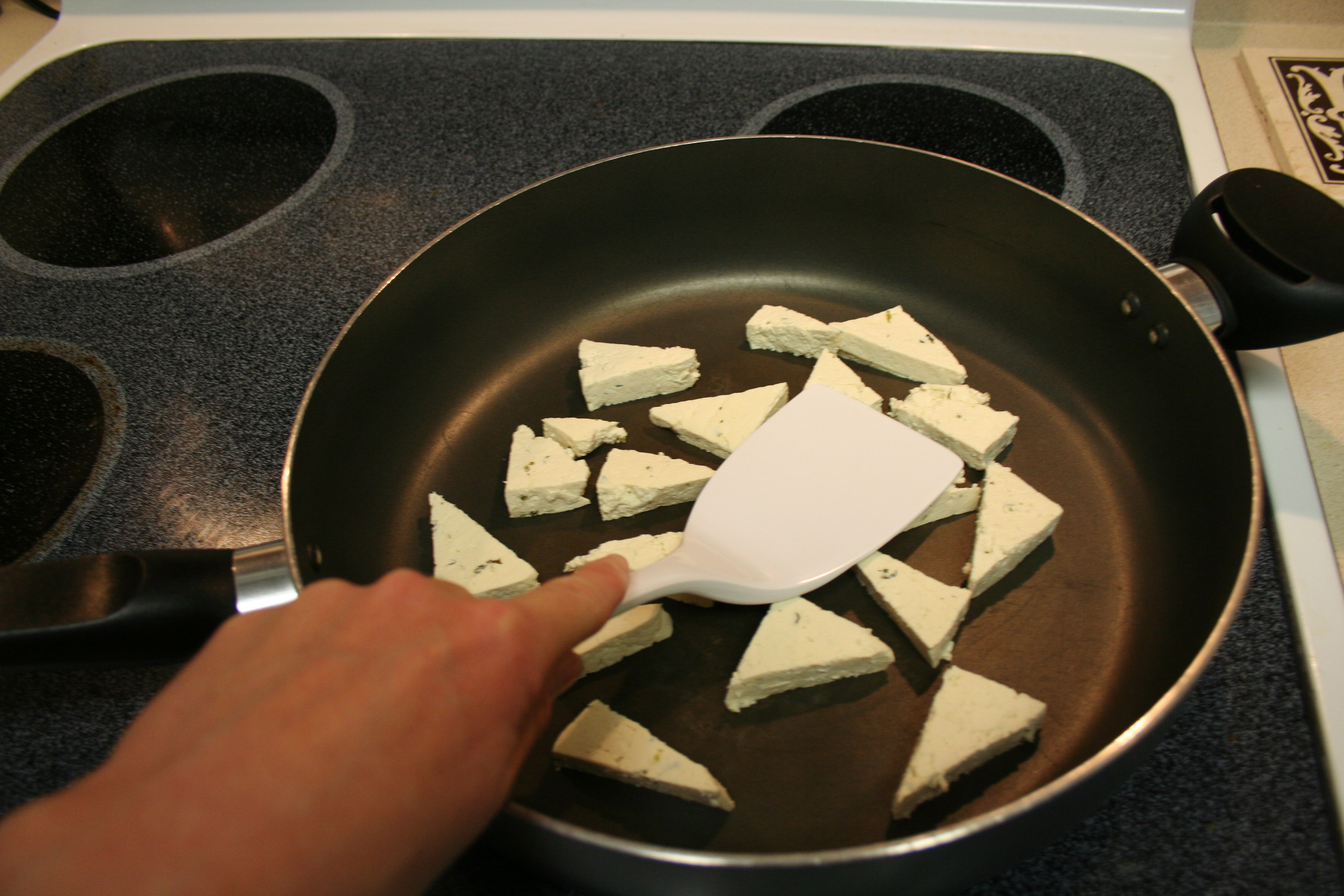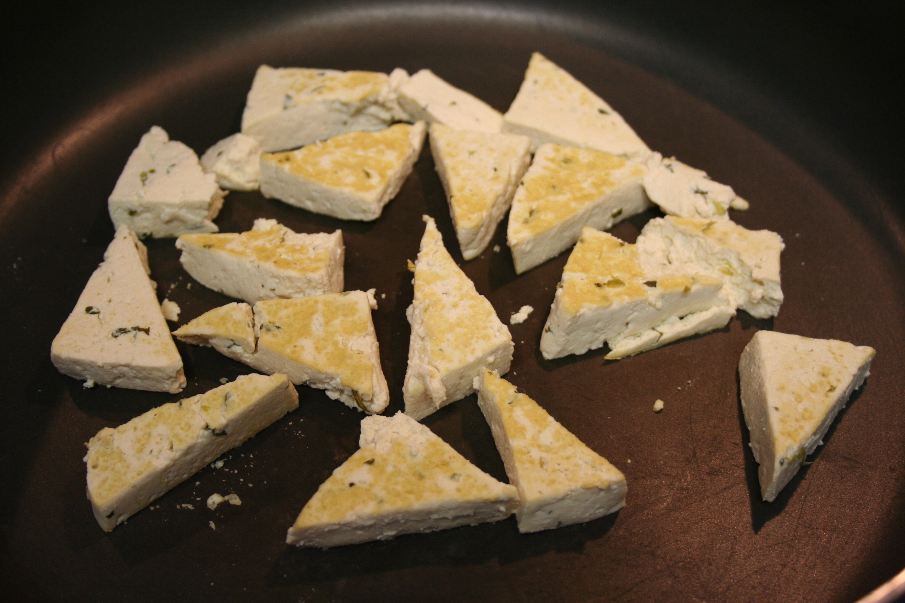 After a minute or so, the pieces slowly began to sizzle, as more water drained out of the spongy bits and hit the hot pan. I took a spatula and gently pressed against each piece, again to drain more water.