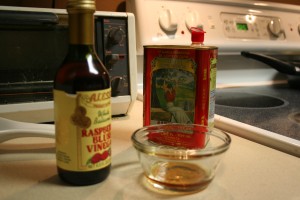 With a little olive oil and raspberry vinegar, I made a little dressing for a spinach and sprout side salad.