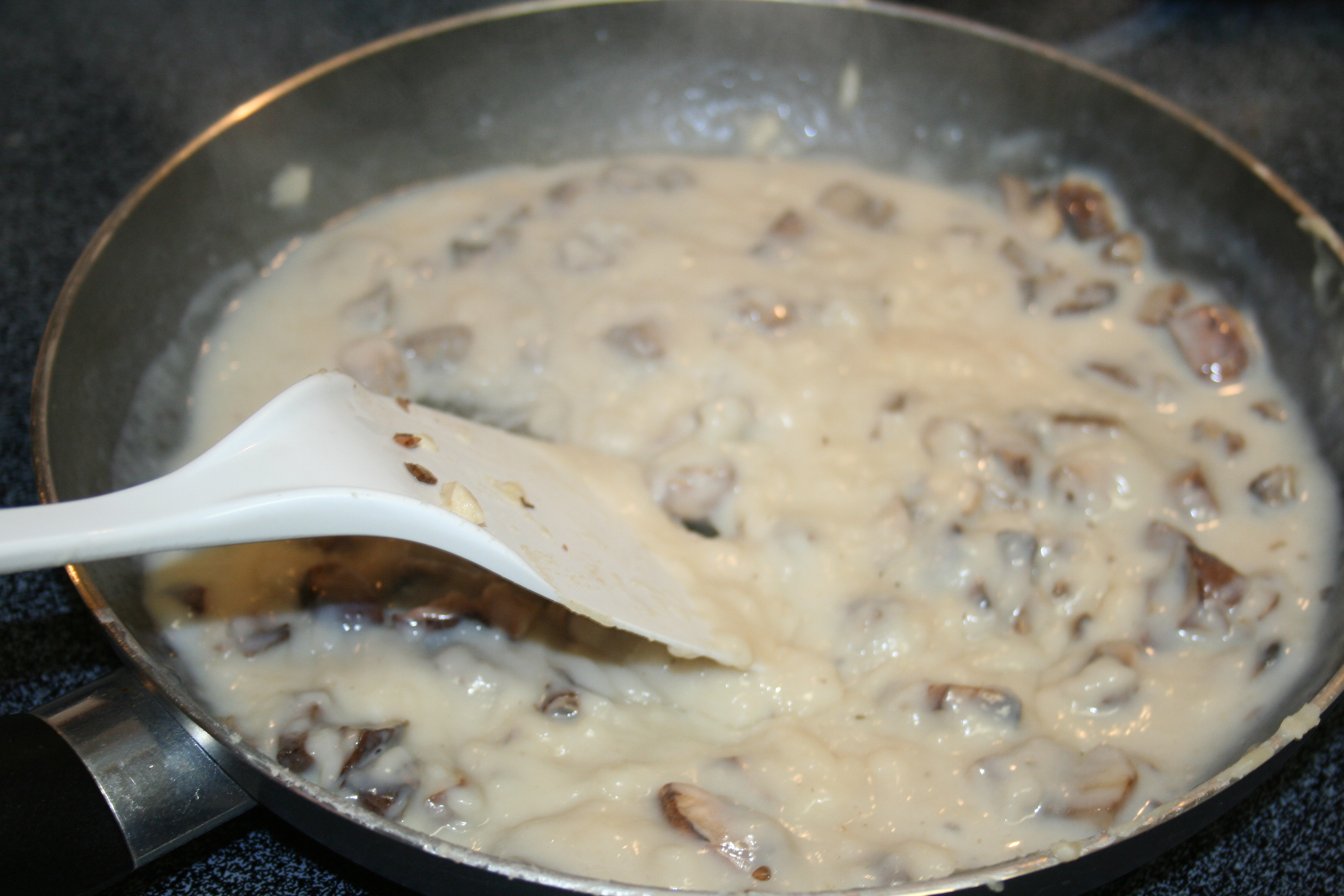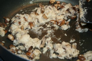 I added in the mushrooms, then put it back on the heat, bringing it to a boil and stirred again until smooth.