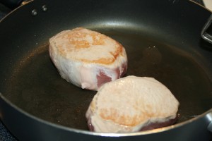 I started on the pork chops, cooking them on both sides until they were about 3/4 done (I think I only cooked them halfway though…)