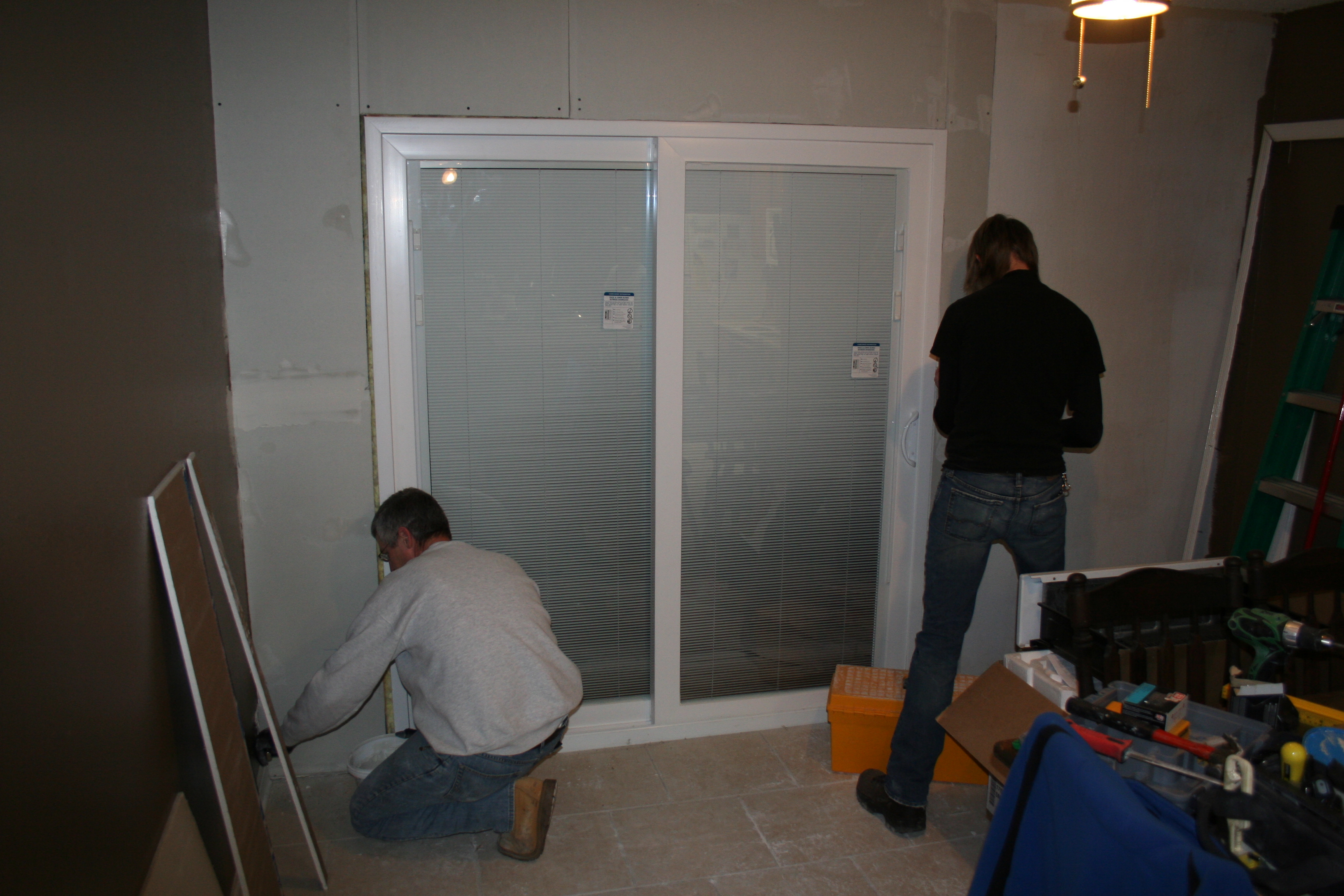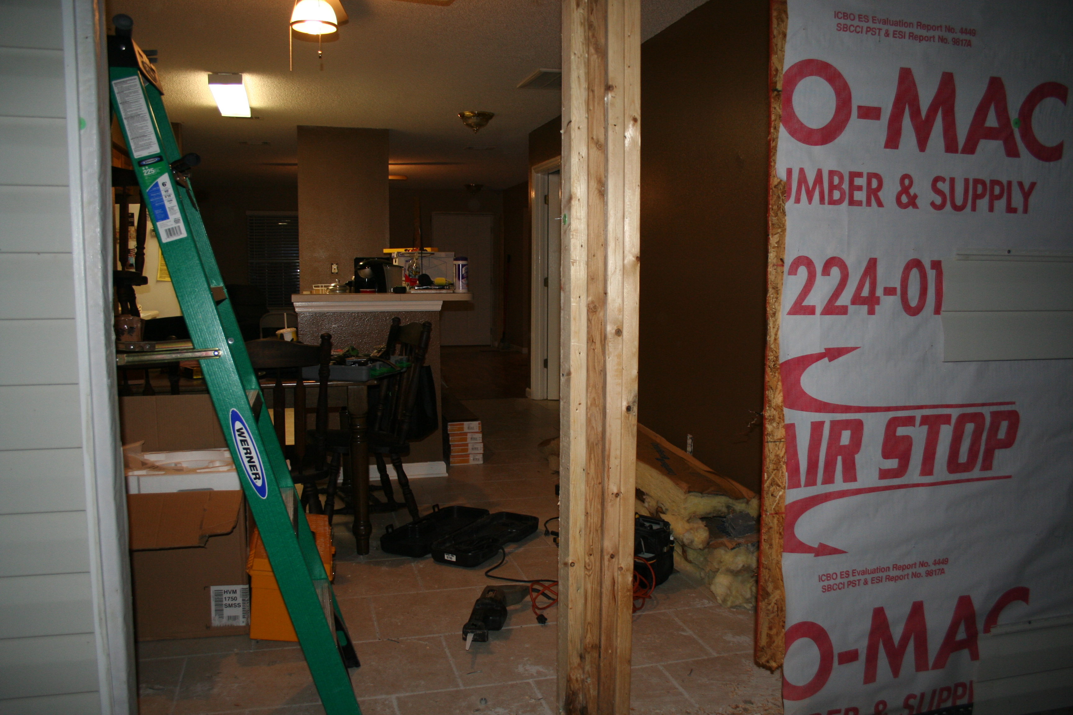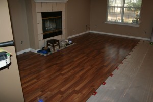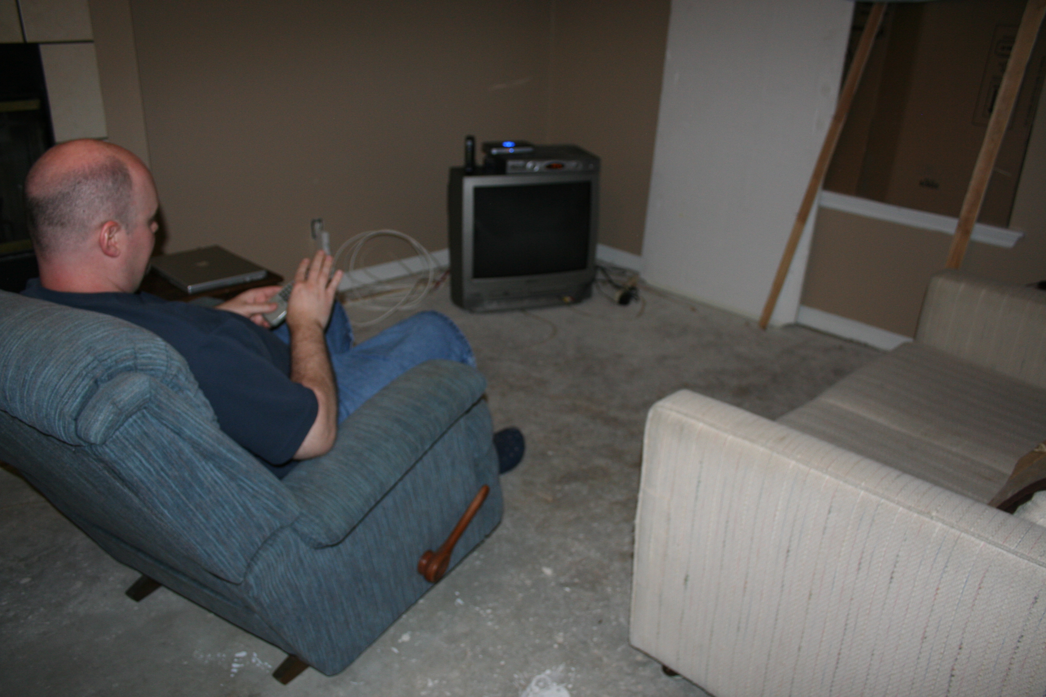 One of my favorite house photos is the one from New Year’s Eve, when Drew and I took a break from house chores and relaxed in front of the TV with champagne. There was cardboard covering the windows, a bare subfloor underfoot, and our modest loveseat and recliner plopped in front of the TV, which sat on the bare subfloor. Ah… memories…